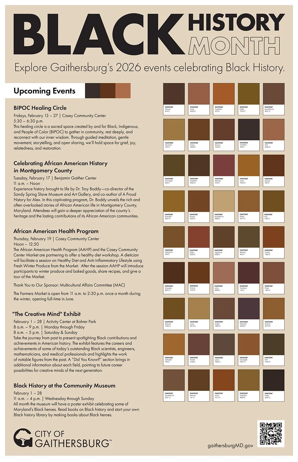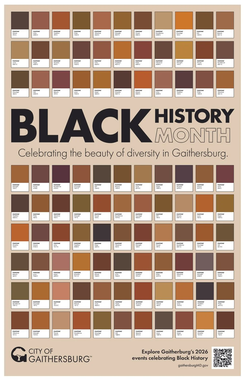 I was very excited and honored to come up with the concept for Black History Month for the City of Gaithersburg. I reflected on Pantone’s color of the year (white ie cloud dancer) and Essence’s powerful response to it. Building on this, the design reflects on the beauty of a more inclusive spectrum of swatches (almost 100 swatches in the main poster). The type treatment minimizes the word “month” to highlight the importance of celebration and honor outside of the 28 days of February.